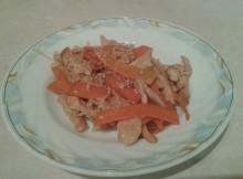 Ingredience 2 bločky sušených vaječných nudlí (cca 120 g) 1 lžička slunečnicového oleje 2 kuřecí prsíčka, nakrájená na proužky 3 velké mrkve, nakrájené na ‚sirky‘ 2 lžíce tekutého medu