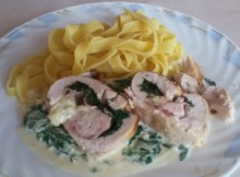 INGREDIENCE 500 g čerstvého špenátu, 4 kuřecí prsíčka sůl, mletý černý pepř, 80 g plátků šunkym 200 g plísňového sýra, 250 ml smetany ke šlehání olej na vymazání