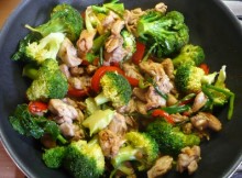 omáčka sójová 1 polévková lžíce olej olivový 10 g zázvor 2 ks paprika červená 2 stroužky česnek 2 ks cibule jarní 400 g maso kuřecí 500 g brokolice